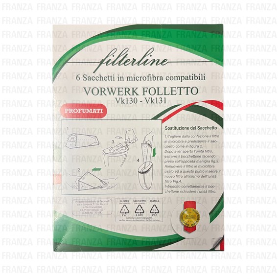Ricambi VK130 - VK131 VORWERK - FVK280/P Adattabile Folletto VK130 - VK131Made in ItalySacchetti PROFUMATI in microfibra confezione scatolata 6 pezzi Prezzo: riservato utenti iscritti Dettagli
